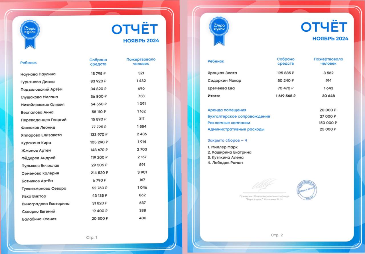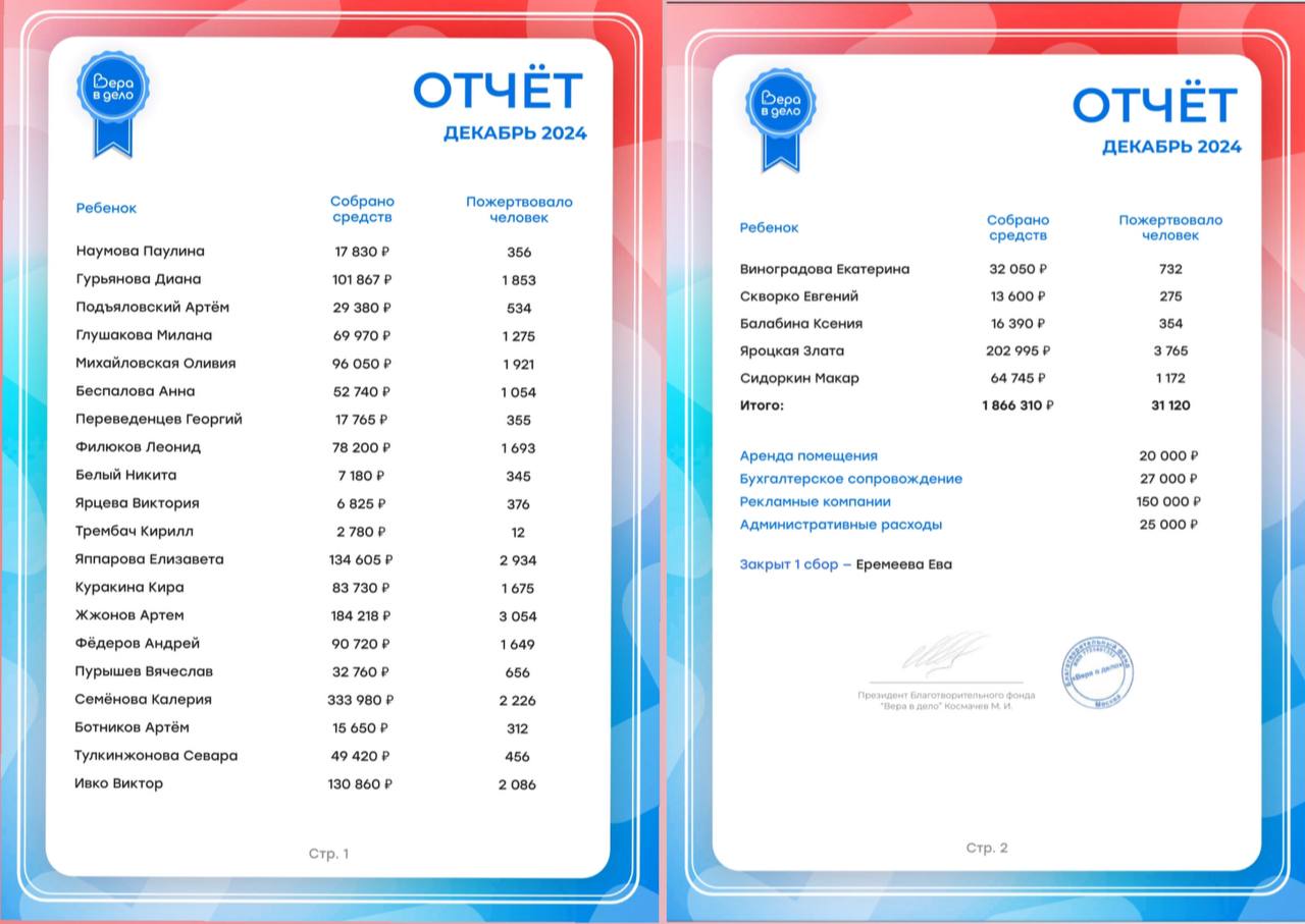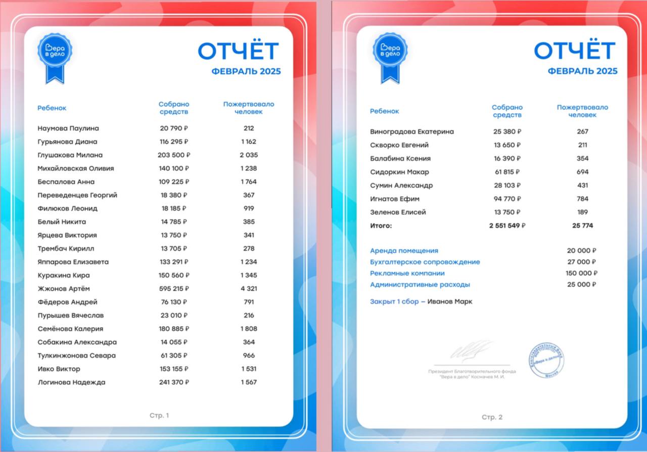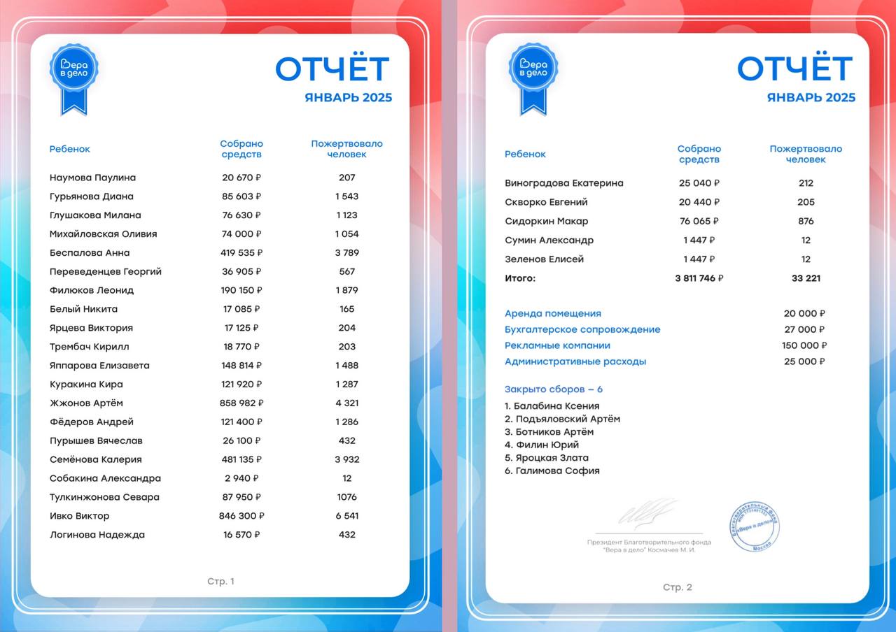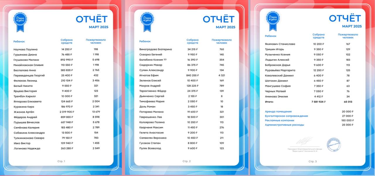 Главное в работе фонда “Вера в дело” — эффективность и полная прозрачность. Мы дорожим вашим доверием. Именно поэтому нам важно регулярно отчитываться и рассказывать о том, что было сделано благодаря вашей поддержке.