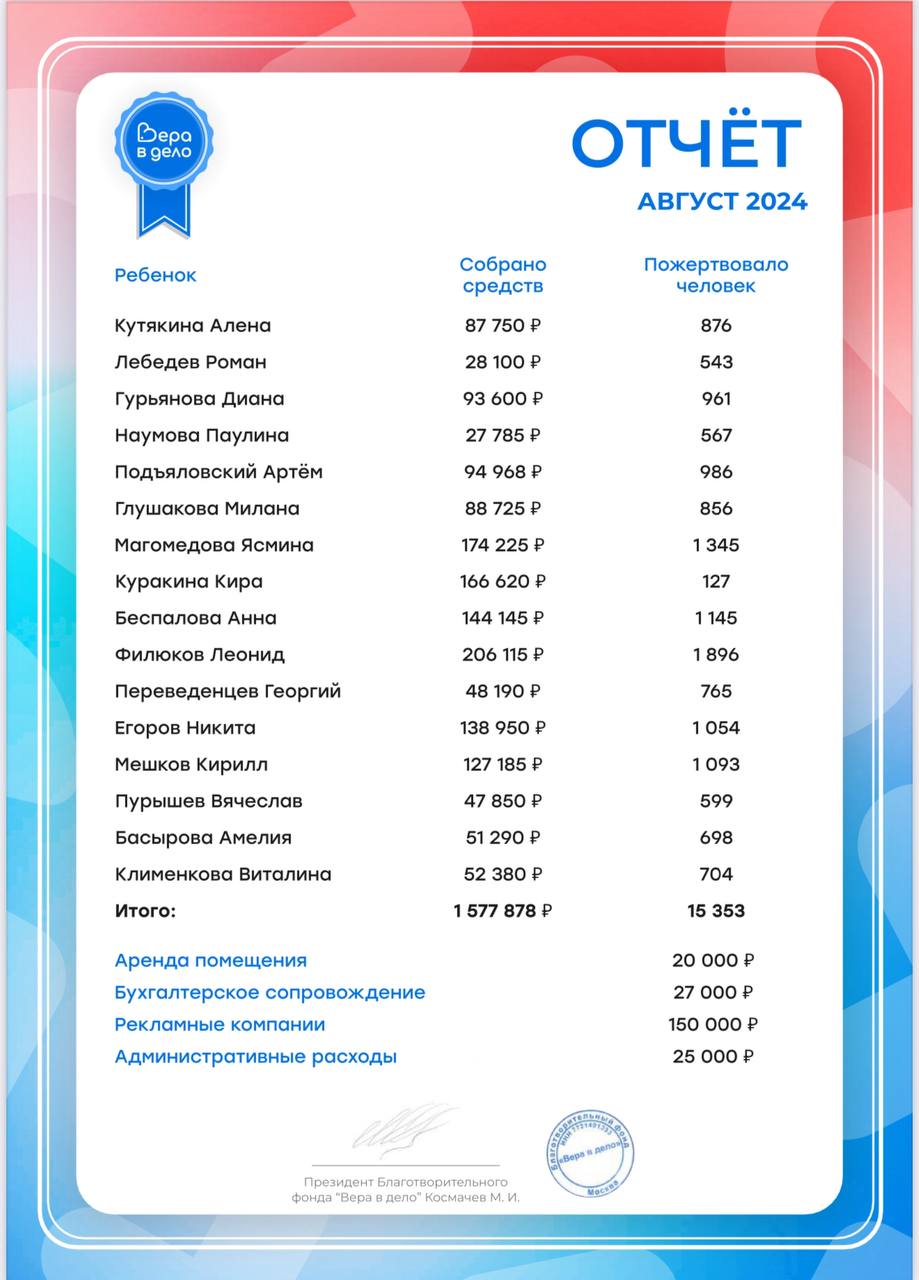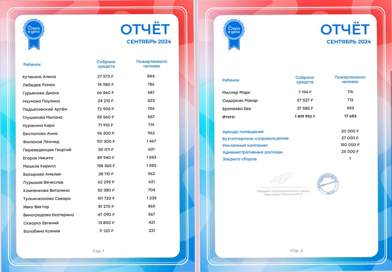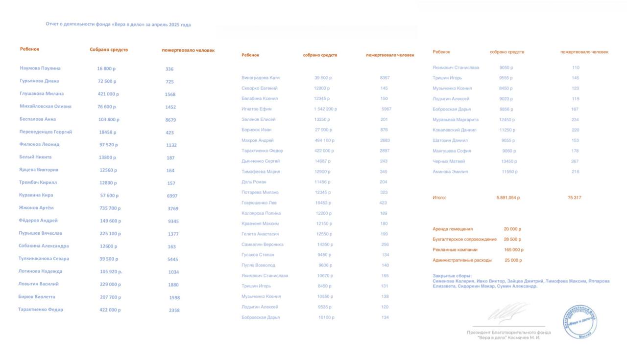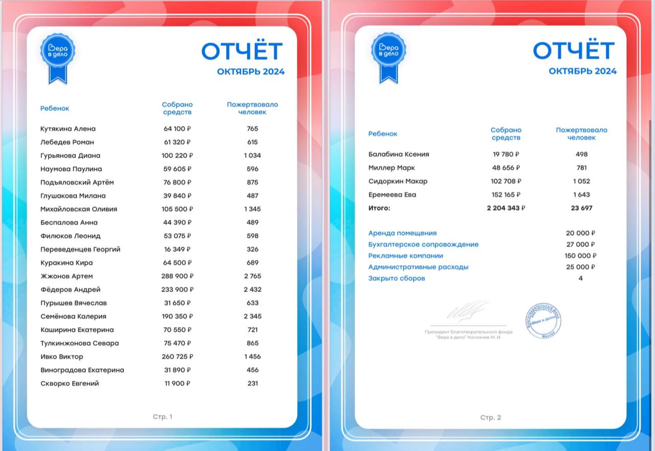 Главное в работе фонда “Вера в дело” — эффективность и полная прозрачность. Мы дорожим вашим доверием. Именно поэтому нам важно регулярно отчитываться и рассказывать о том, что было сделано благодаря вашей поддержке.