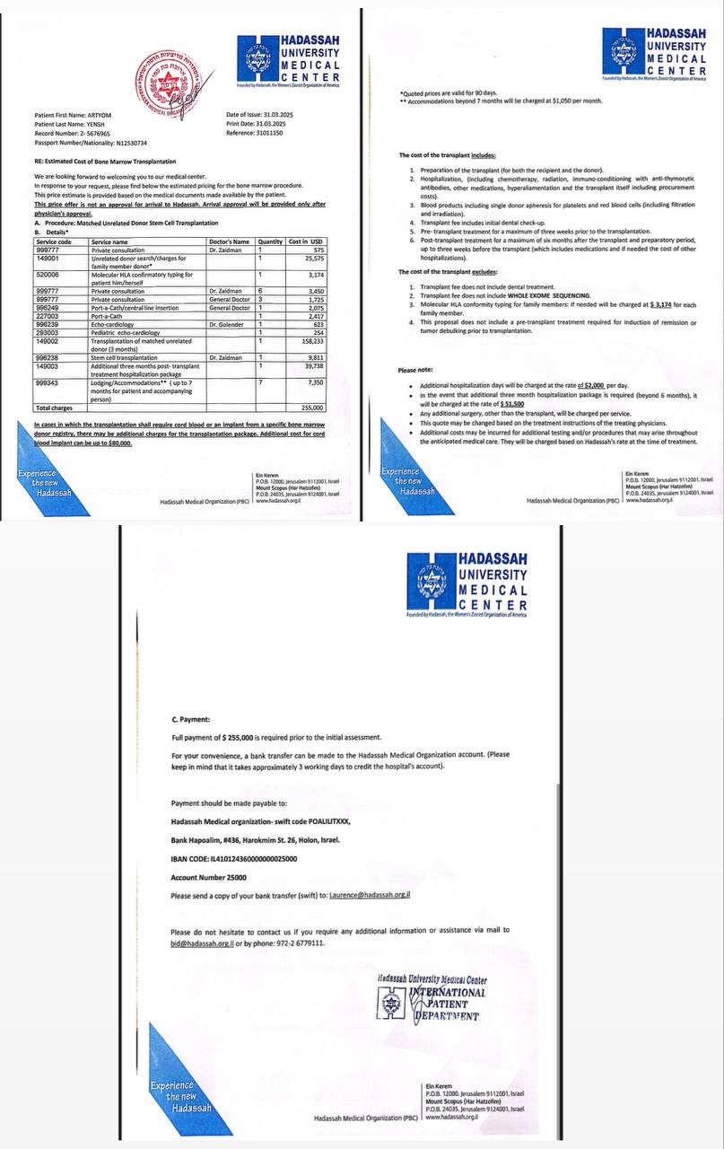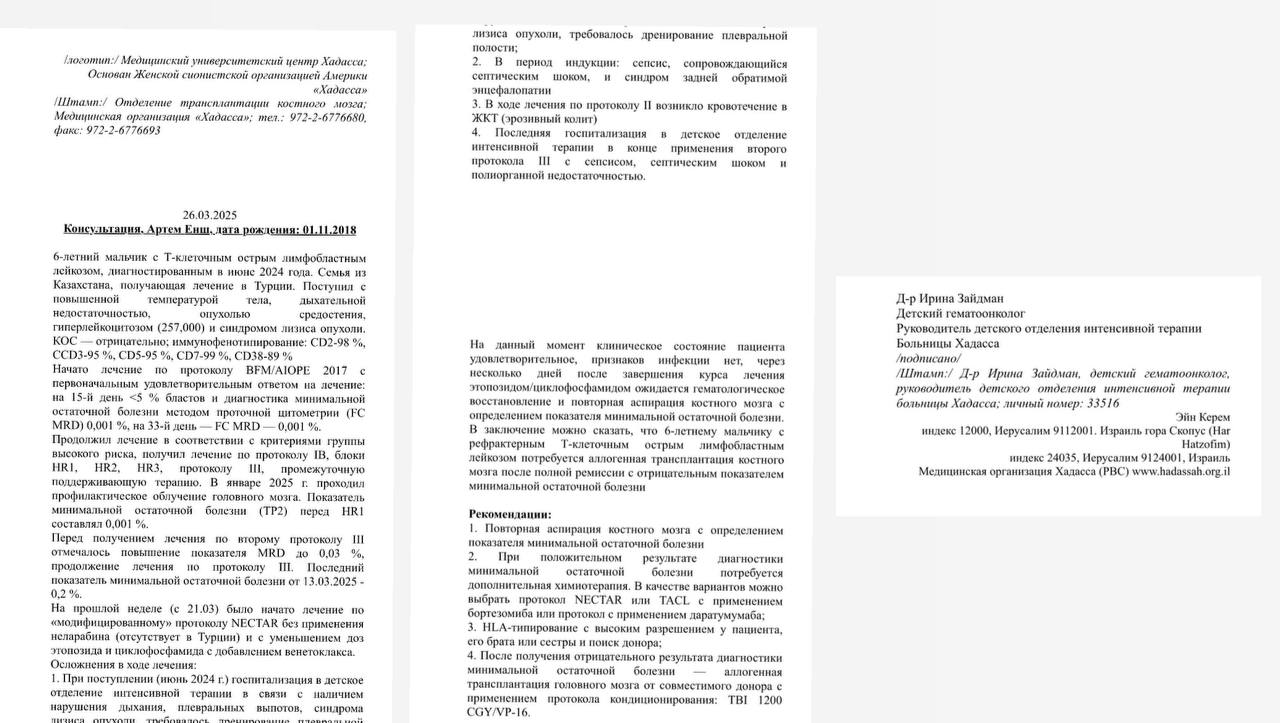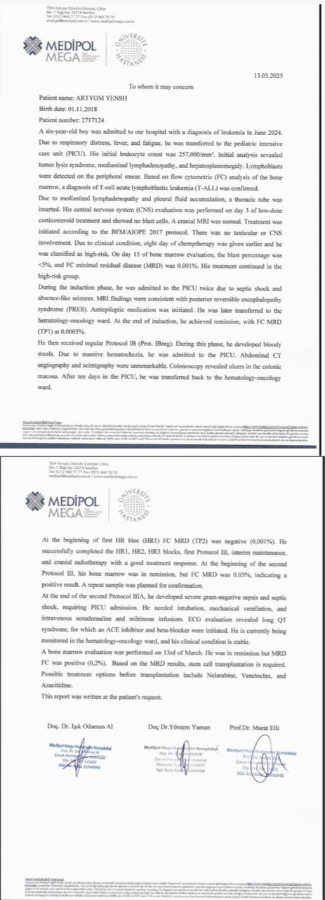 Единственный шанс на жизнь для Артёма — трансплантация костного мозга 🧬. Донор найден, и это настоящее чудо 🙌. Мы уже в Израиле, в клинике Hadassah. Артём прошёл ещё один курс химии 🧪 и сейчас восстанавливается. Впереди решающая пункция — если показатели будут хорошими, нас сразу готовят к пересадке.