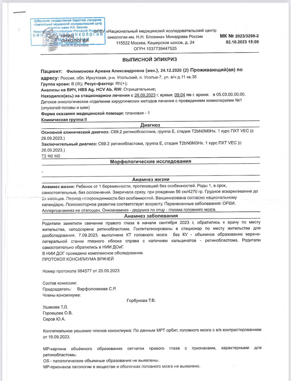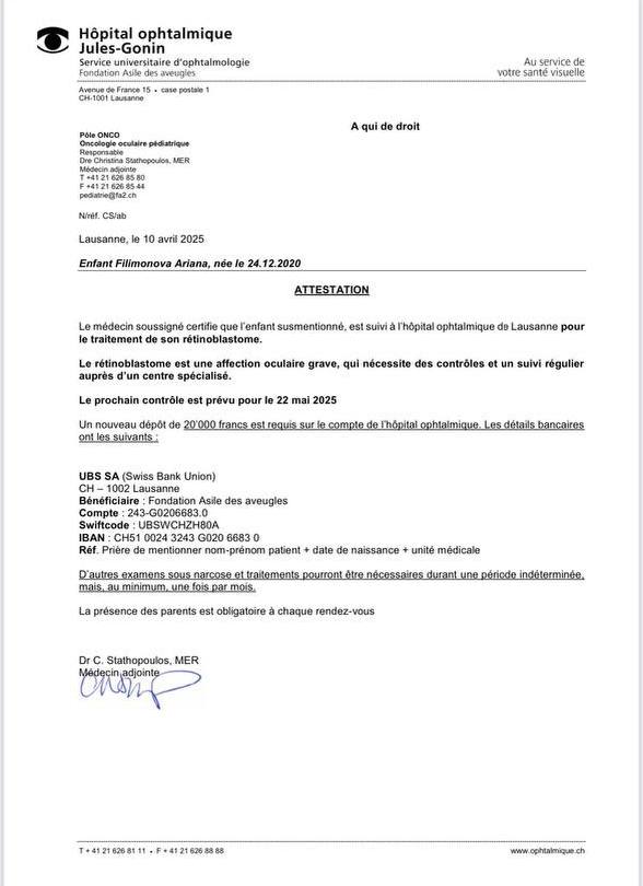 Врачи говорят, что опухоль слишком большая, и нам нужно срочно действовать. В нашей стране не могут гарантировать, что она сохранит зрение, а если не начать лечение немедленно, опухоль может дать метастазы и пойти в головной мозг. Единственная надежда — это операция в Швейцарии, где специалисты с большим опытом готовы помочь. 🏥👩‍⚕️ Они уверены, что есть возможность не только спасти её зрение, но и победить болезнь. Но стоимость лечения — 1 225 000 рублей. Эта сумма для нас неподъемна. 💸