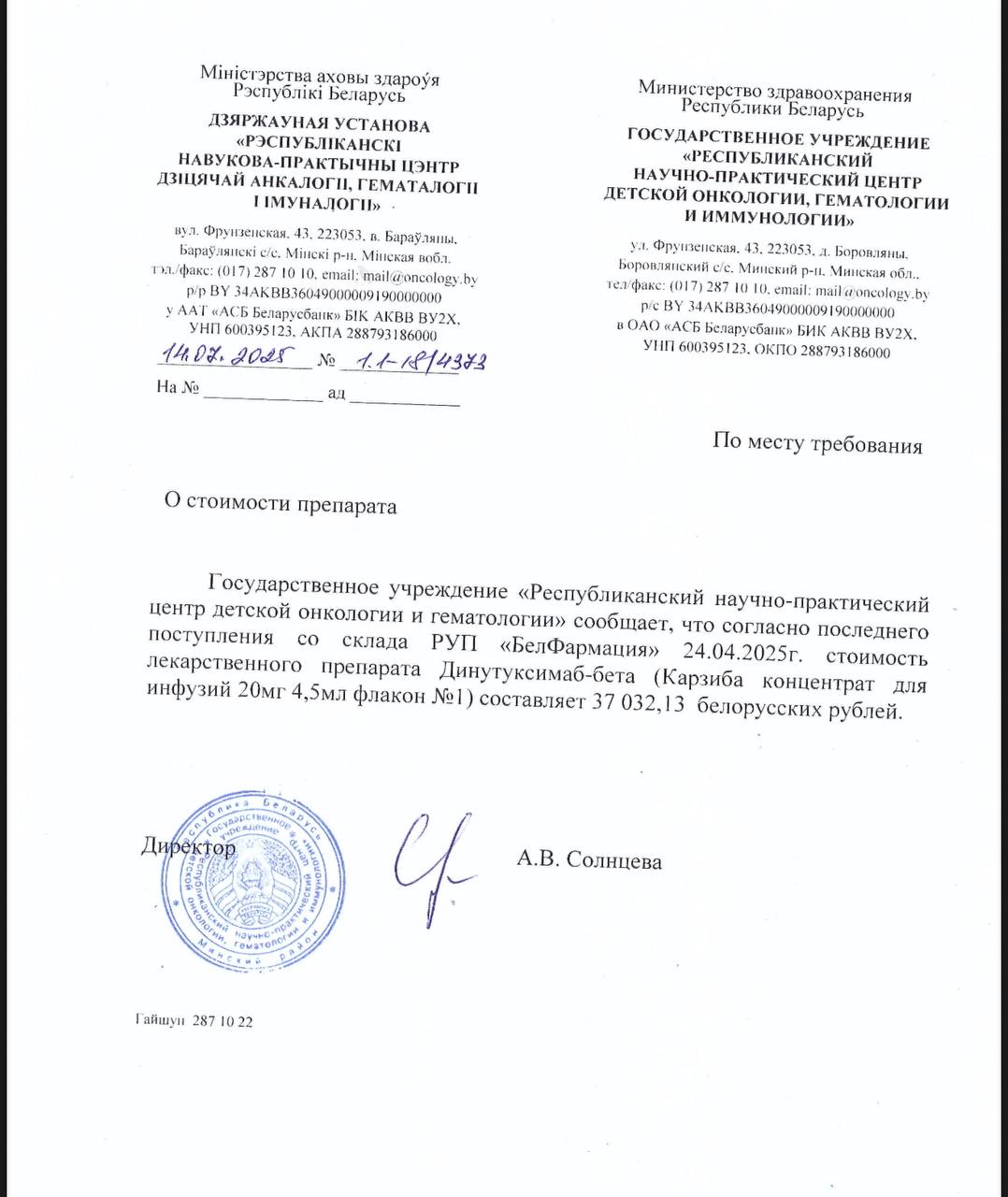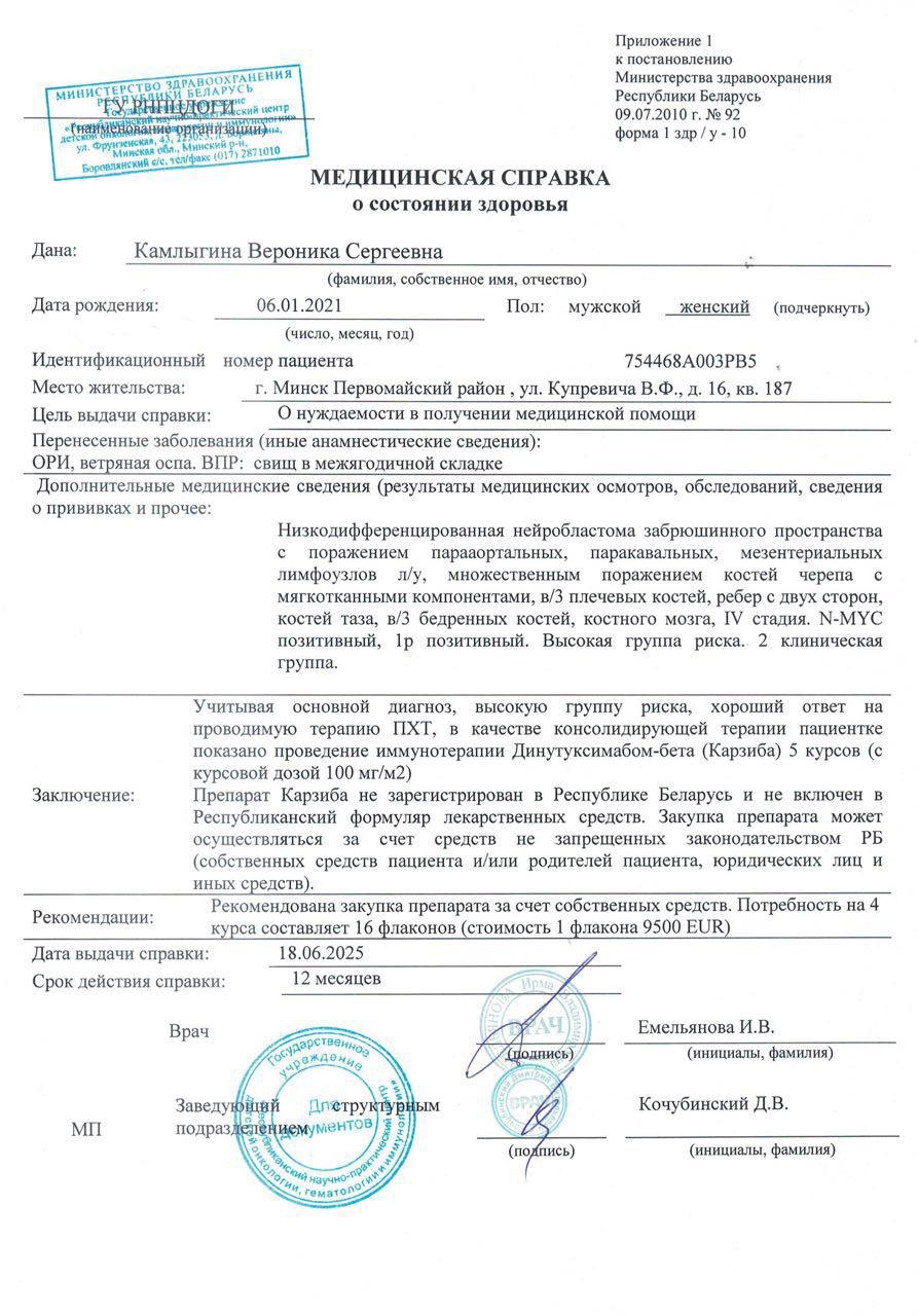 Впереди операция 🔪. Высокодозная химия с пересадкой костного мозга 🧫. И главное — иммунотерапия препаратом Динутуксимаб-Бета. Это лекарство спасает жизни — но в Беларуси его нет ❌. Государство его не закупает. Оно просто отсутствует.