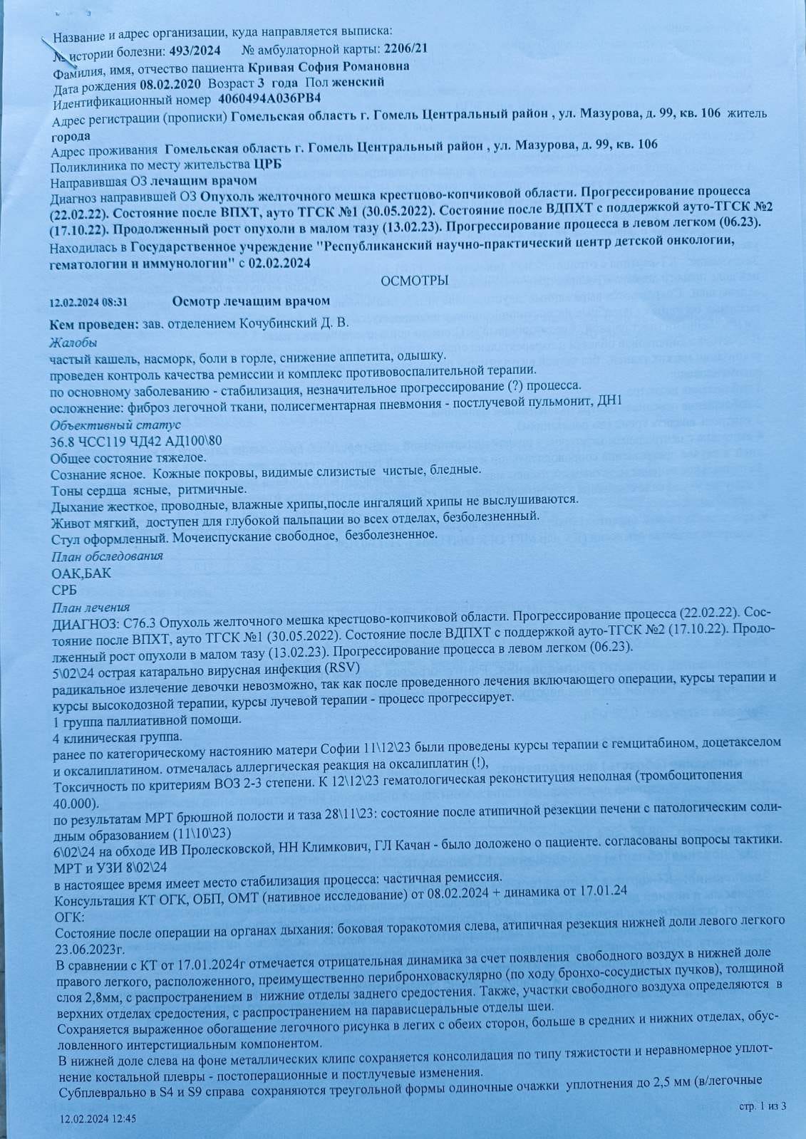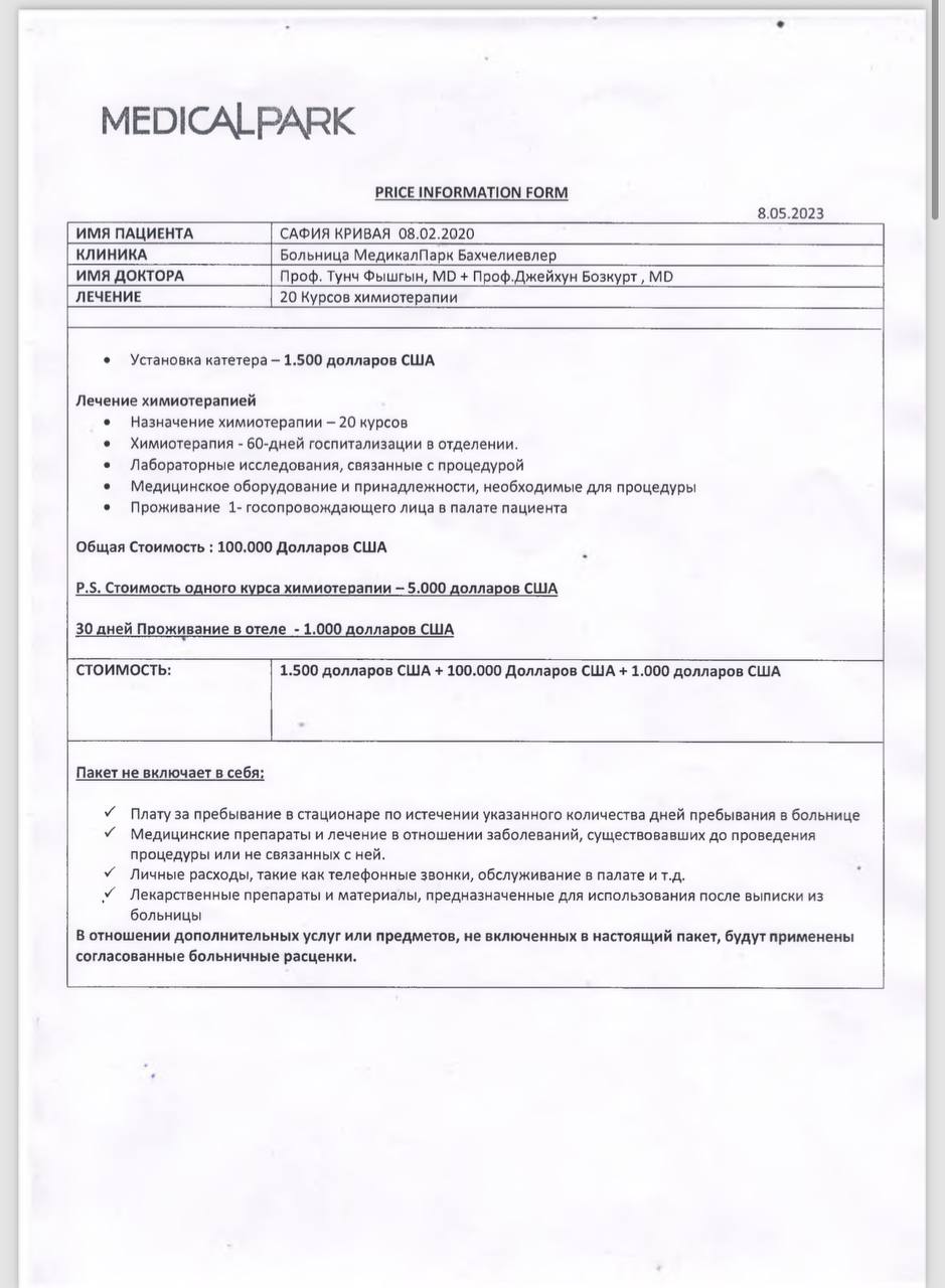 Что бы понять всю сложность нашего диагноза, нам необходимо было сделать ПЭТ КТ с глюкозой, для этого пришлось обратится в МИБС в СПБ.В результате исследования были выявлены единичные очаги. В МИБС нам предложили тоже лечение, что и в РБ, которое не дает результата!Поэтому я стала искать и узнавать про разные клиники сама и нашла клинику в Турции, которая имеет успешный опыт лечения таких тяжелых заболеваний! По результатам обследования турецкими врачами был предложен новый протокол лечения, который включает в себя новую для нас комбинацию химиопрепаратов. В клинике нам выставили счет в сумме 2.100.000р, сама я финансово не потяну это лечение, поэтому я слезно молю и прошу всех добрых людей помочь нам спасти жизнь моей девочки! Без вас я не справлюсь с этой страшной бедой! Помогите нам!