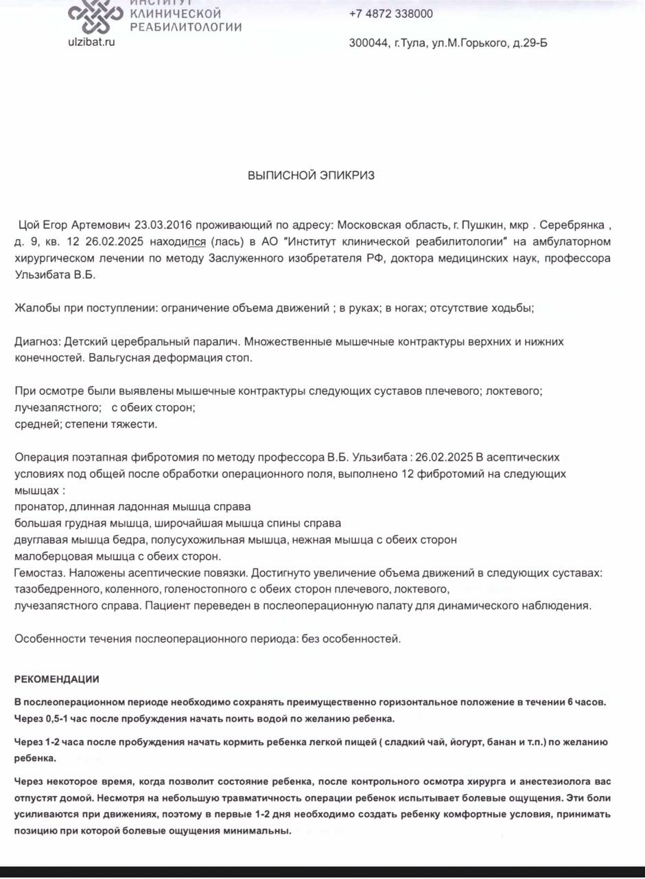 26 февраля 2025 года в Институте клинической реабилитологии Егору провели тяжёлую операцию — поэтапную фибротомию на обеих ножках и ручке. Теперь у моего сына появился реальный шанс научиться ходить 🚶. Но впереди — самое главное: длительная и дорогая реабилитация, без которой операция может потерять свой смысл 😢.