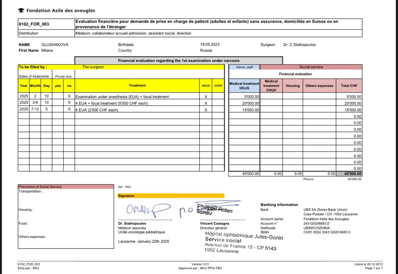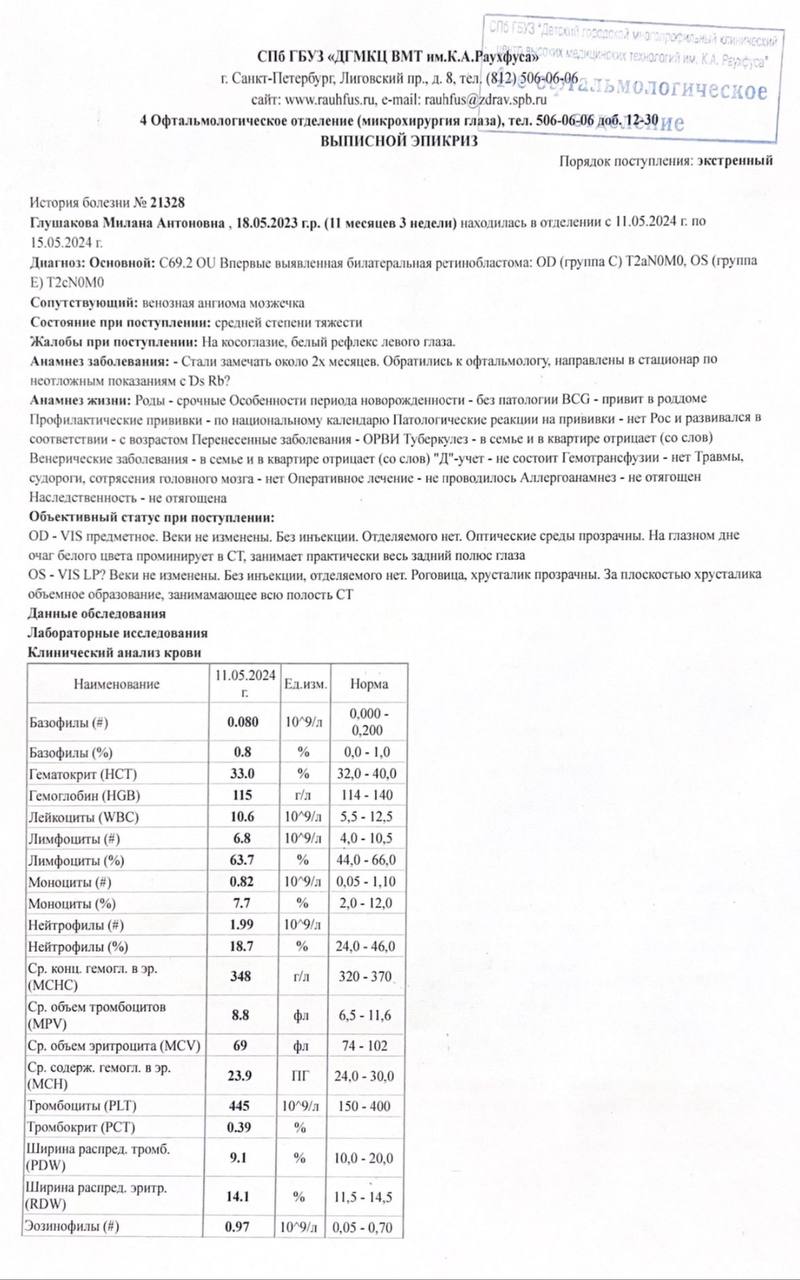 После осмотра нам поставили страшный диагноз: двусторонняя ретинобластома — злокачественная опухоль сетчатки глаз на последней стадии. 😢 Это редкое заболевание, и шансы на спасение были бы очень малы, если бы мы не нашли клинику, которая может помочь. В России нам предлагали удаление глаз, но мы не готовы сдаться, даже если это значит бороться до последнего. Мы нашли клинику в Лозанне, где есть шанс сохранить глазки и спасти нашу девочку. 🌟