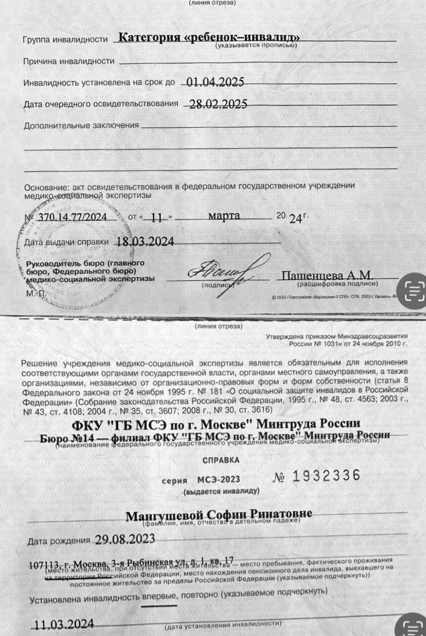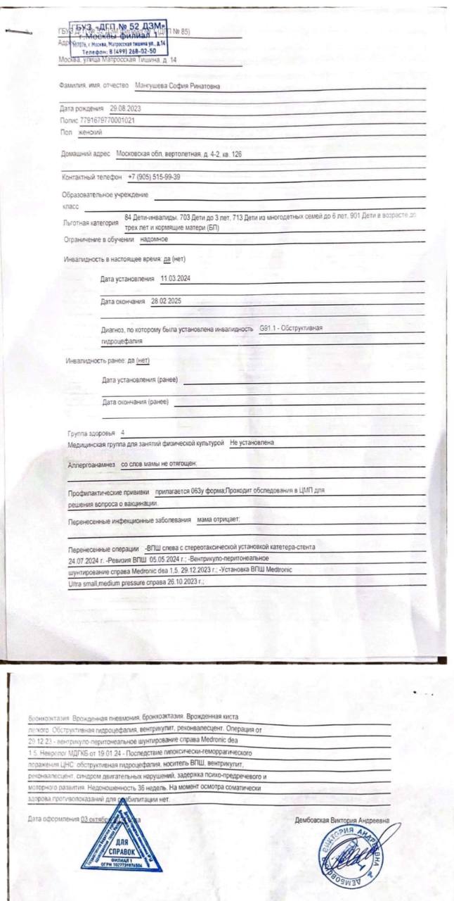 Здравствуйте🙏🏻!я многодетная мама ,воспитывающая 3 детей в одиночку🥺,самая маленькая дочь имеет диагнозы-гидроцефалия,ДЦП😖💔. Родилась недоношенной на 36 неделе😭,путем экстренного кесарева сечения.Сразу после родов попала в реанимацию❤️‍🩹🥺,где пролежала полтора месяца под ивл😢‼️,врачи буквально с того света ее вытащили⚠️.. После реанимации,пролежала в больнице,откуда вышла,когда ей было почти 5 месяцев.. у нее было 9 операций, в голове стоит уже 3 по счету шунт,предыдущие не приживались.Ей полтора года,она полностью лежачая,даже голову не держит,не умеет жевать и плохо глотает,постоянно поперхивается ,когда кушает,из-за этого она ест только жидкую еду(даю детское пюре в баночках).Она нуждается в постоянной реабилитации.. Вот ее диагнозы: G80.0 Спастический церебральный паралич. G80 Детский церебральный паралич, спастический тетрапарез. GMFCS V уровень, mini-MACS IV уровень.