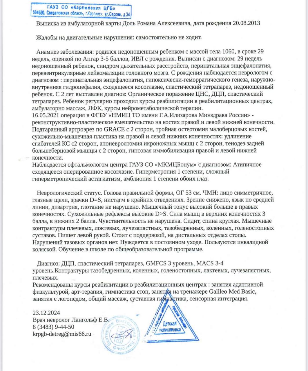 Здравствуйте, дорогие благотворители! 🙏💖Я  мама Романа, моему сыну 7 лет 👦. Хочу рассказать вам о нашем пути и попросить вашей помощи в лечении и реабилитации моего мальчика. Роман родился в срок, но, к сожалению, уже в младенчестве были замечены отклонения в его развитии. В возрасте 1 года Роману поставили диагноз — детский церебральный паралич (ДЦП) 🚶‍♂️💔. Это стало настоящим ударом для всей нашей семьи, ведь мы не знали, как помочь нашему малышу 😢. Ромочка не мог сидеть, не мог держать голову, и нам было сложно смириться с этим. Но с каждым днем мы продолжали бороться 💪, и, благодаря вашим добрым сердцам и помощи, мы нашли силы идти дальше. Мой сын — настоящий борец 💪💙. Он прошел несколько курсов реабилитации 🏥 и научился сидеть 🪑, ползать 🐾 и ходить с поддержкой 🤝. Но, к сожалению, до сих пор Роман не может ходить самостоятельно 🚶‍♂️ и у него сохраняются проблемы с координацией движений и силой в ногах 🦵. Несмотря на все трудности, Рома — очень добрый и светлый мальчик 🌟. Он обожает рисовать 🎨, любит слушать музыку 🎶 и мечтает однажды побегать с друзьями во дворе 🏃‍♂️, как все дети. Он любит животных 🐾, а его самые любимые игрушки — это машинки 🚗 и конструкторы 🧩. Роман часто спрашивает меня, когда он сможет бегать и прыгать, как другие дети 🤔. И я обещаю ему, что мы сделаем все, чтобы эта мечта стала реальностью 🏅.Чтобы помочь Роману в дальнейшей реабилитации, мы нуждаемся в значительных средствах 💸. Лечение и реабилитация требуют огромных затрат, и, к сожалению, мы не можем справиться с этим самостоятельно 😞. Мы обращаемся к вам с просьбой помочь нам пройти новый курс реабилитации, который даст Роману шанс на улучшение его состояния и поможет ему двигаться к самостоятельной ходьбе 🚶‍♂️.Каждый вклад — это шаг к выздоровлению нашего сына и шанс увидеть, как он будет радоваться жизни без ограничений 💖. Мы будем безмерно благодарны за любую помощь и поддержку 🙏💞.Спасибо вам за ваше внимание и доброту! ❤️